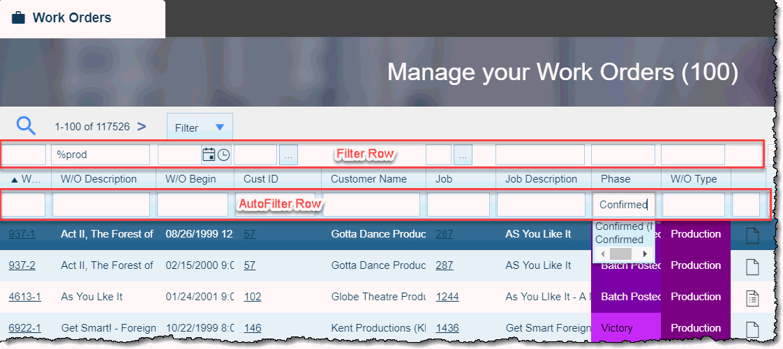 If you enter a value in the Customer Name cell in the Filter Row, then click the search icon, the system will display all Work Orders for that Customer. You can then enter "Confirmed" in the 'Phase' AutoFilter cell and "Duplication" in the 'WO Type" AutoFilter cell. The remaining values in the Search window will be all Work Orders for the selected Customer with a Phase of 'Confirmed' and a W/O Type of 'Duplication'.