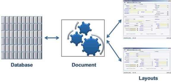 - Layouts — A layout allows users to interface with a particular document. Both screen and report layouts may be created and modified via the LAYOUT APPLICATION to present as many or as few fields/columns (and their associated business rules) from the document as desired. Layouts can only be constructed based on the attributes available in their underlying documents or by those supported document customizations, and using the formatting capabilities available within the Layout Application.