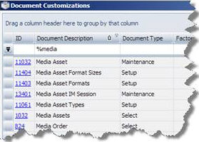 You must first select an existing document to identify the source from which you will build your new layout. For example, if you want to make a layout for the Media Asset Maintenance Application document, you would select the row that shows Media Asset in the Document Description Field of the Document Customizations Window and Maintenance in the Document Type Field.