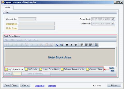 You may only add note fields to Note Block tab pages. Doing so prompts the system to change the tab into a rich-text typing area for notes. If you add additional note fields to a Notes Tab Page, those notes will be accessible as tabs at the bottom of the window. Refer to the Work Order Application’s NOTES TAB PAGE topic for an example and specific details of how the tab functions.