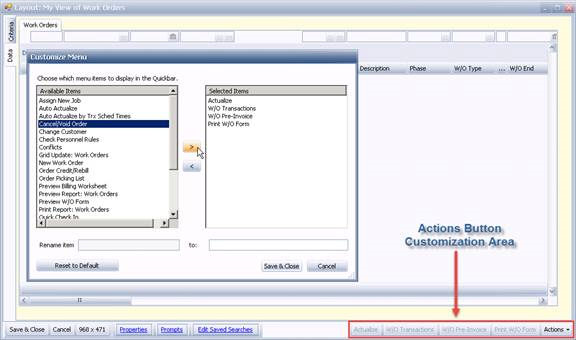 All possible Actions menu commands for the selected document are available in the Customize Menu Window. This includes commands that will not display when users access the layout as a program window based on established business rules and data restriction. Buttons made from commands that do not display in the Actions Button menu will also not display.